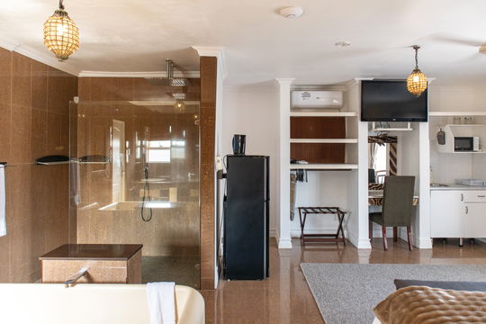 Indulge in the ultimate comfort and convenience as you unwind in our luxurious Africa Room. The room is thoughtfully designed to offer you a serene and relaxing experience. Immerse yourself in the beauty of our beautiful walk-in shower, and let your worries melt away as you indulge in pure relaxation within the confines of a luxurious stone bath.